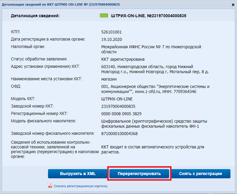 4. Откроется окно с детальной информацией вашего ККТ. Нажмите на кнопку внизу текста с пометкой «Перерегистрировать»: