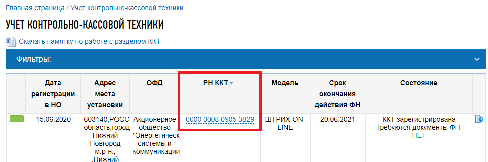 3. В данном разделе указаны все сведения по зарегистрированным ранее девайсам. Активная ККМ помечена зеленым цветом. Нажмите на 16-значный код вашей кассы в столбце «РН ККТ»: