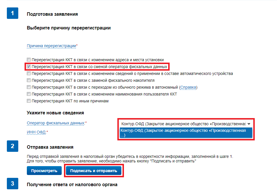 5. Откроется бланк заявления на перерегистрацию ККТ. Ставим галочку напротив пункта со сменой ОФД.