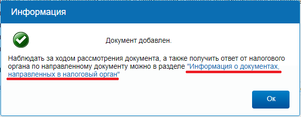 8. Всплывет уведомление «Запрос добавлен». Проверить статус заявления и узнать итоговое решение можно, кликнув на надпись «Информация о документах, направленных в налоговый орган», в текстовом окне: