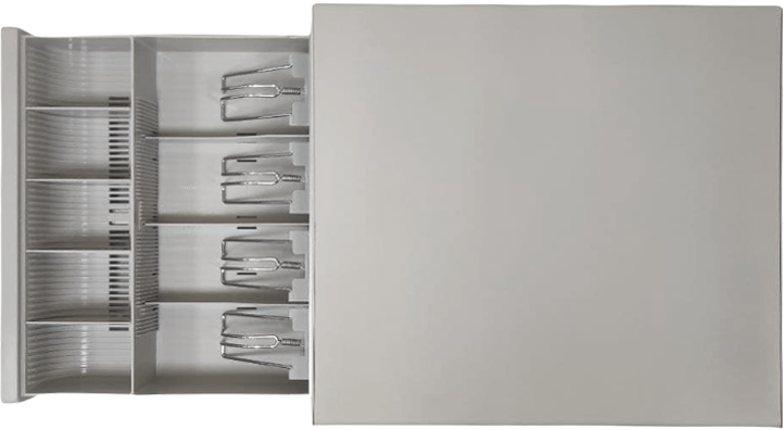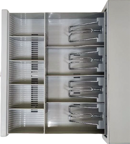 4 отделения для банкнот оборудованы металлическими фиксаторами, а 5 ячеек для монет имеют удобный покатый край. Размер всех отсеков регулируется до необходимой ширины. Трёхпозиционный электромеханический замок рассчитан на 1 000 000 циклов открытия.
