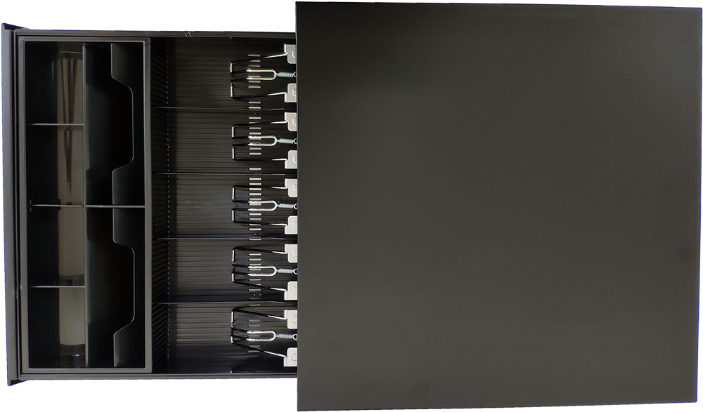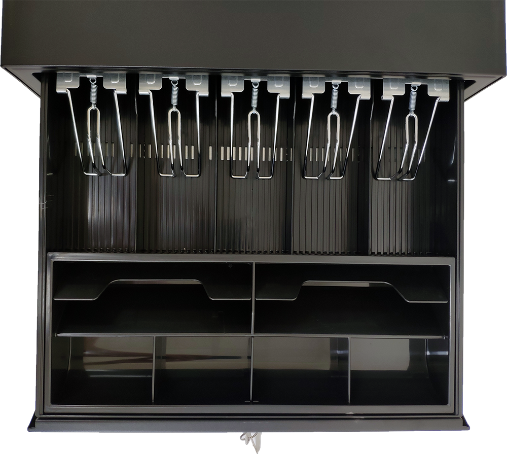 Денежный ящик с автоматическим замком для подключения к POS-системам и кассовым аппаратам. Имеет 7 секций под банкноты 4 под монеты. на передней панели расположены 2 секретные прорези для купюр большим номиналом.
