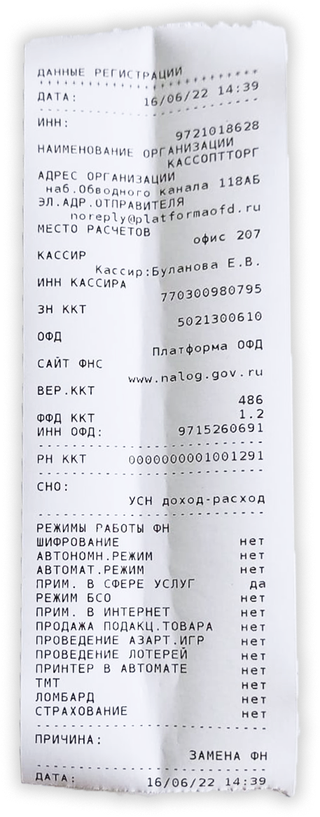 • касса распечатает Отчет о перерегистрации с заменой ФН (самостоятельно отправлять его никуда не нужно, ваш ОФД автоматически отправит его в ФНС);