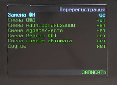 • откроется окно со списком причин - убедитесь, что в поле Замена ФН установлено значение ДА, (если стоит значение НЕТ - нажмите кнопку ВВОД, чтобы его изменить);