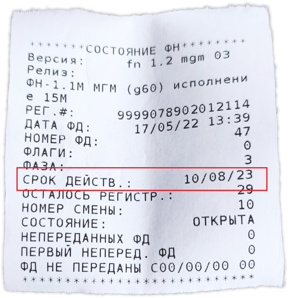 За 30 дней до истечения ресурса фискального накопителя при закрытии смены будет выводиться сообщение на чеке «РЕСУРС ФН МЕНЕЕ 30 ДН».