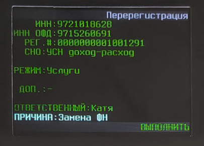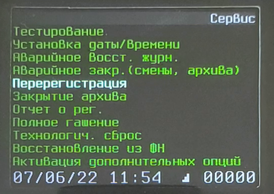 • если все верно, то нажмите кнопку ВВОД для подтверждения перерегистрации - ККТ будет обрабатывать команду 10-30 секунд;