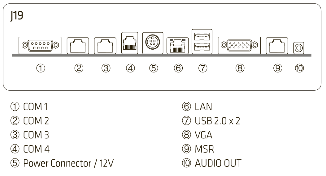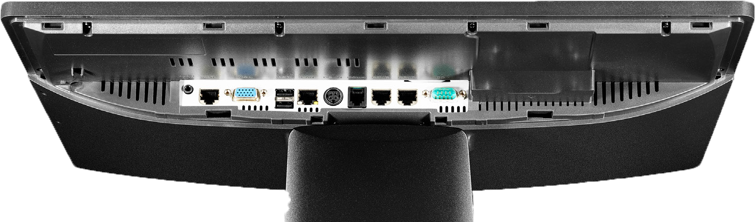 USB / COM (RS-232) / VGA / RJ-11 / Ethernet / RJ-45 / DC Jack