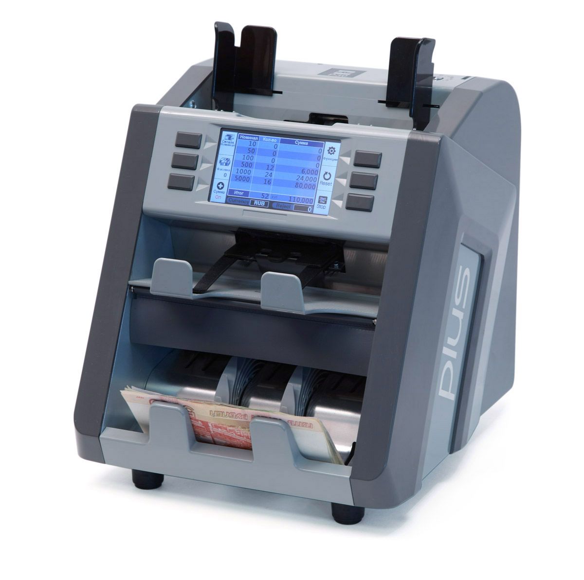 Счетчик банкнот PRO P30 одновременно может обрабатывать 7 валют ( RUB, USD, EUR, GBP, CNY, JPY, CHF ). Всего счетчик поддерживает 50 валют. Устройство обладает возможностями фасовки, калькуляции номиналов, а так же с функциями суммирования и пересчета смешанной пачки. Кроме этого, есть возможность сортировки по номиналу, году эмиссии, лицу и ориентации. Способен пересчитать до 1500 банкнот в минуту. Загрузочный карман вмещает 500 банкнот, приемный - 200, отбраковочный - 50. Устройство имеет яркий LСD дисплей. Также счетчик проводит контроль подлинности с помощью: