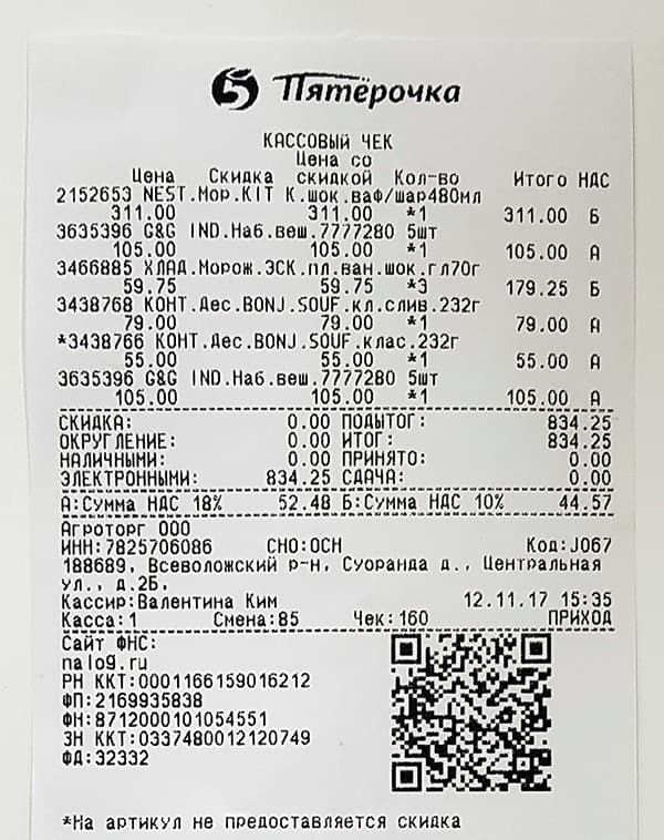 Кассовый чек Ритейл-01Ф Пятерочка