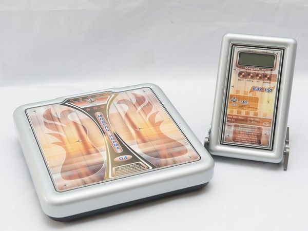 Напольные фасовочные электронные весы ТВЕС ВЭУ-150-50/100--Д-А с выносным терминалом. Возможен учет массы тары и суммирования результатов. В весы встроен аккумулятор.