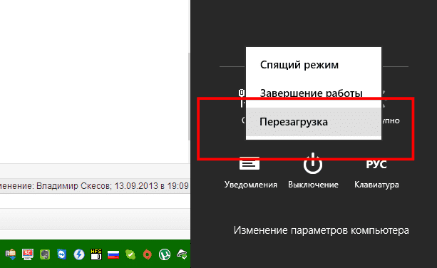 1.Для того, чтобы отключить проверку цифровой подписи на Windows 8, необходимо загрузиться в меню выбора параметров загрузки системы. Для этого нажимаем сочетание клавиш Win+I и, зажимая клавишу Shift, выбираем «Выключение» → «Перезагрузка»: