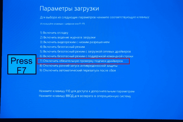 6.  После перезапуска мы окажемся на странице выбора параметра загрузки системы. То есть система загрузиться в том режиме, который мы выберем на данной странице. В нашем случае необходима загрузка в режиме «Отключить обязательную проверку подписи драйверов», поэтому жмём клавишу F7: