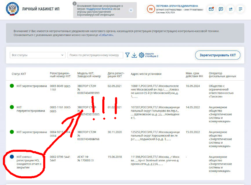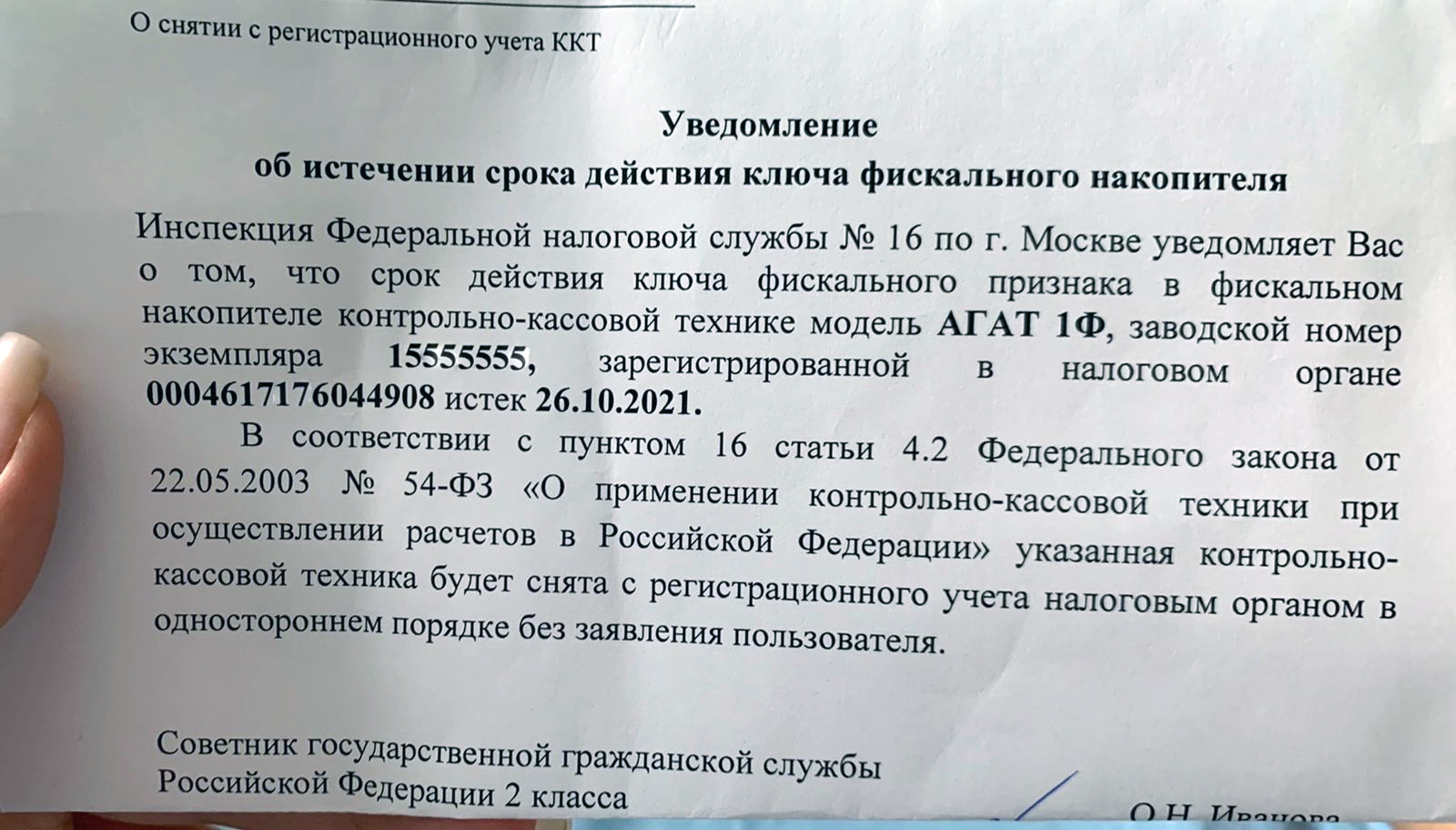 Поскольку снятие в одностороннем порядке делается на усмотрение инспектора, в некоторых случаях кассовый аппарат может быть снят с учета ранее чем через 2 месяца с момента окончания ФН, на практике это может быть и срок в 2 недели. Поэтому перед тем, как преступить к замене фискального накопителя обязательно необходимо проверить статус кассового аппарата в личном кабинете налогоплательщика или в ФНС.