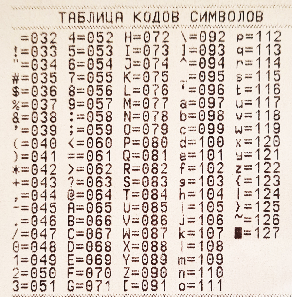 - распечатается таблица кодов символов, с помощью которой позже нужно будет ввести название и пароль сети WiFi;