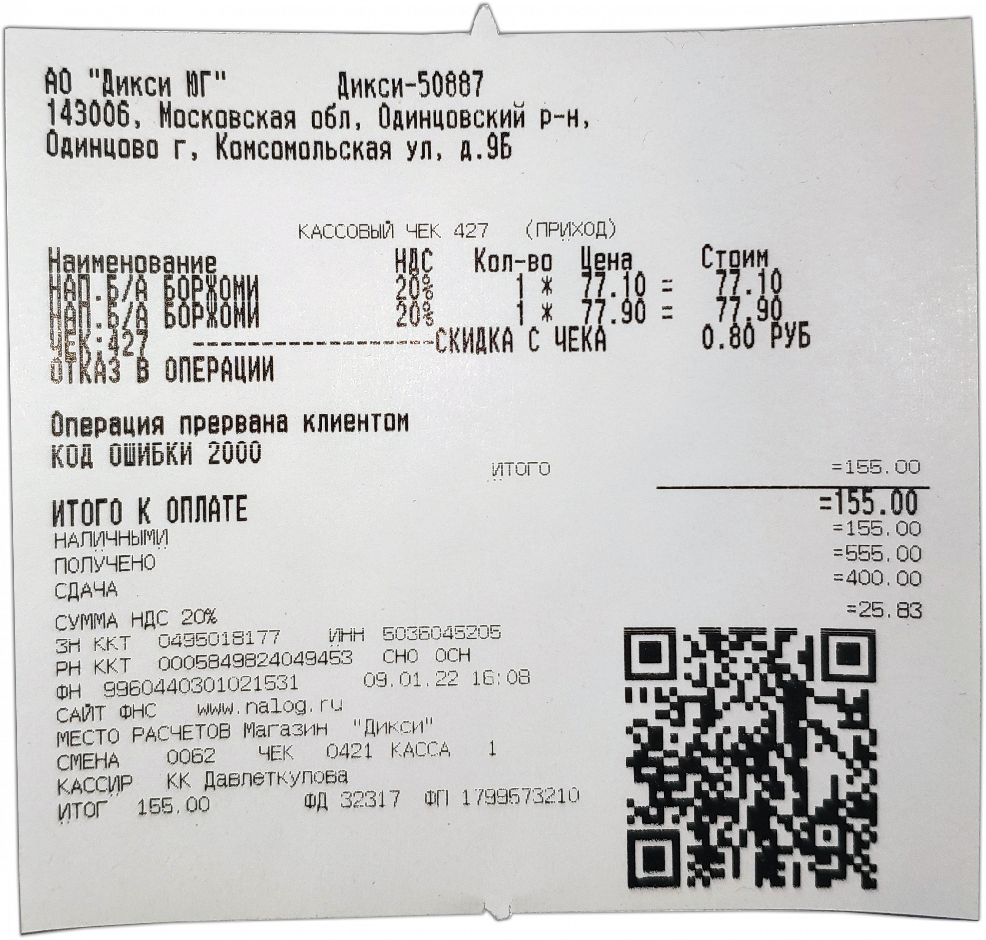 - ВИКИ ПРИНТ 80 ПЛЮС Ф: Кассовый чек Дикси за наличные
