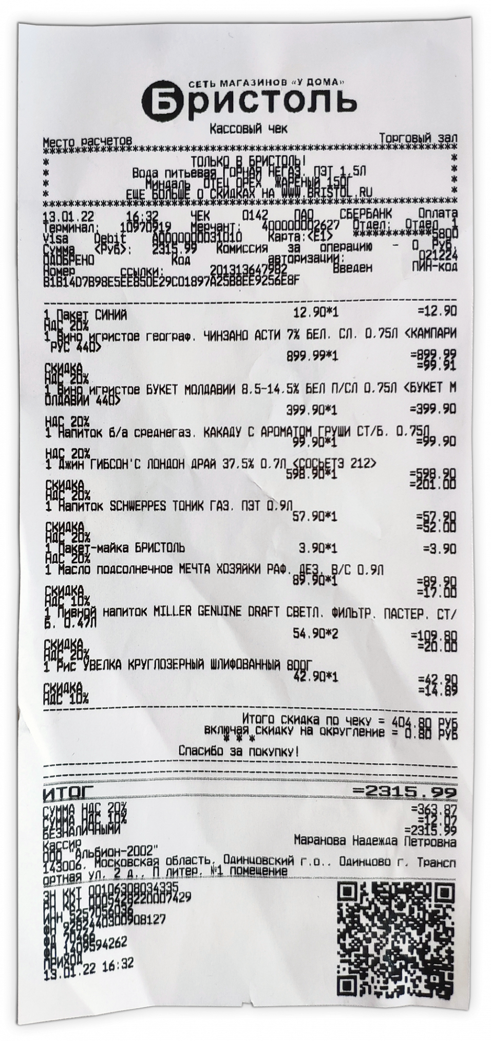 Образец кассового чека магазина по продаже алкоголя Бристоль за безналичные, данные и реквизиты на чеке: номер документа, QR-код, проверка онлайн