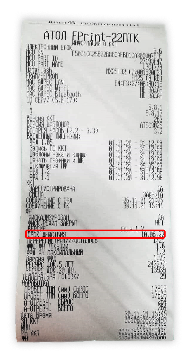 - выйдет чек, в графе СРОК ДЕЙСТВИЯ будет указана дата окончания действия фискального накопителя, который установлен в данный момент в Атол: