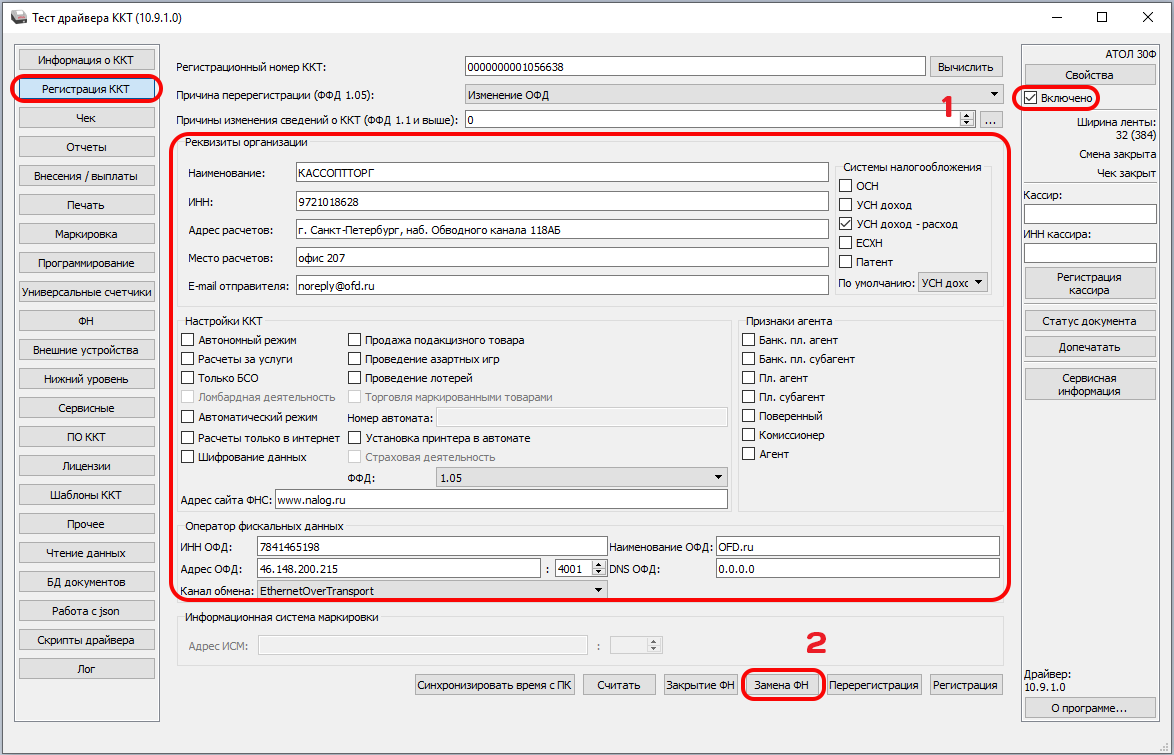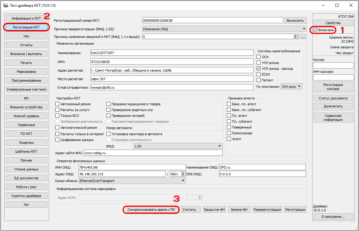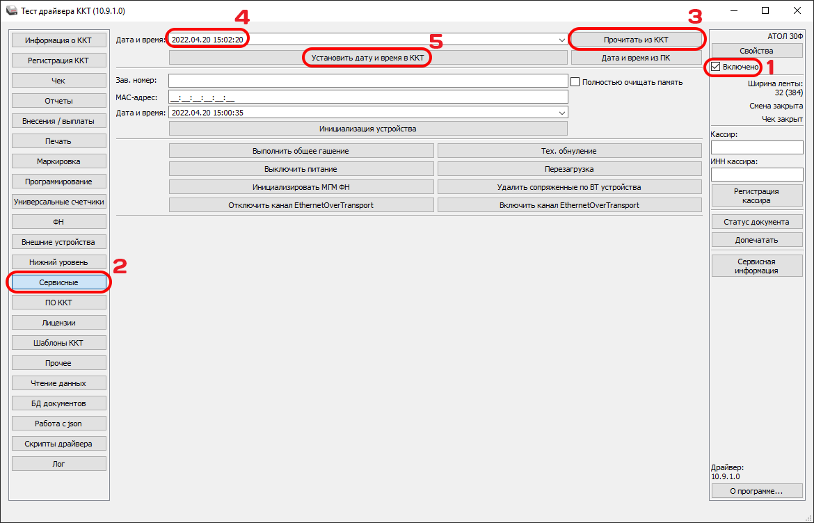 Важно установить правильные дату и время (иначе можно испортить или сократить срок службы нового ФН):- в Тест Драйвере ККТ убедитесь, что галочка стоит на Включено;