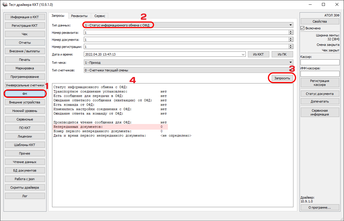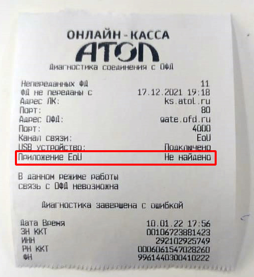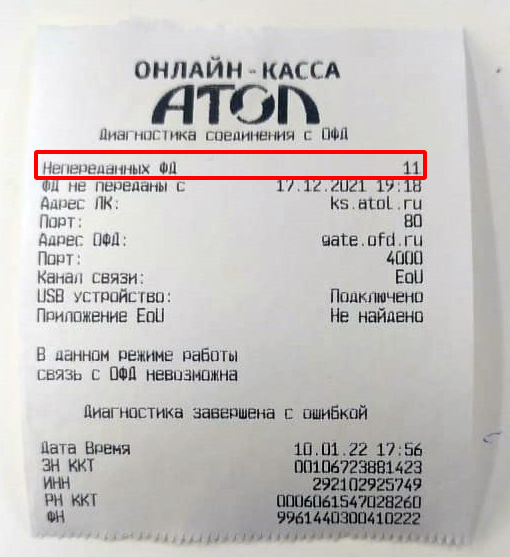 - выйдет кассовый чек, на котором должна быть надпись Непереданных ФД ... (количество). Если у вас там не 0, то подождите пару минут и сформируйте отчет еще раз;
