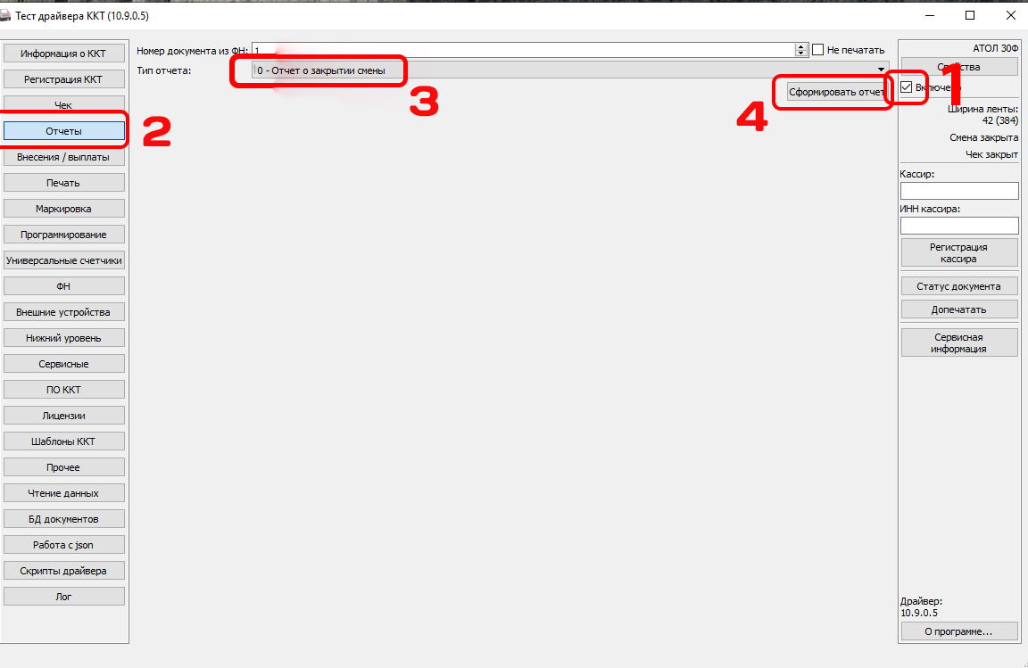 Если смена открыта - ее нужно закрыть:- во вкладке Отчеты в поле тип отчета выберите 0 Отчет о закрытии смены;