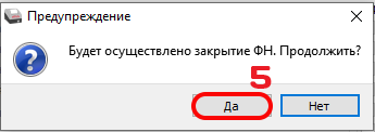- появится окно с предупреждением о закрытии ФН, нажмите Да;