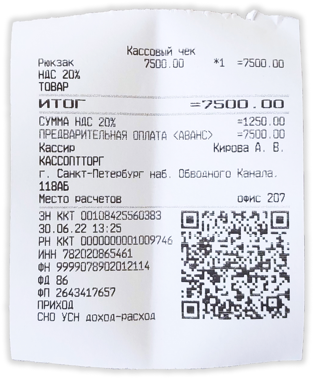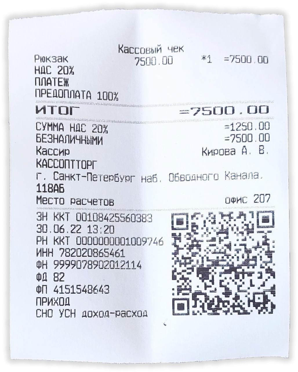 - способ расчета – ПОЛНЫЙ РАСЧЕТ (не отражается в печатной форме чека);