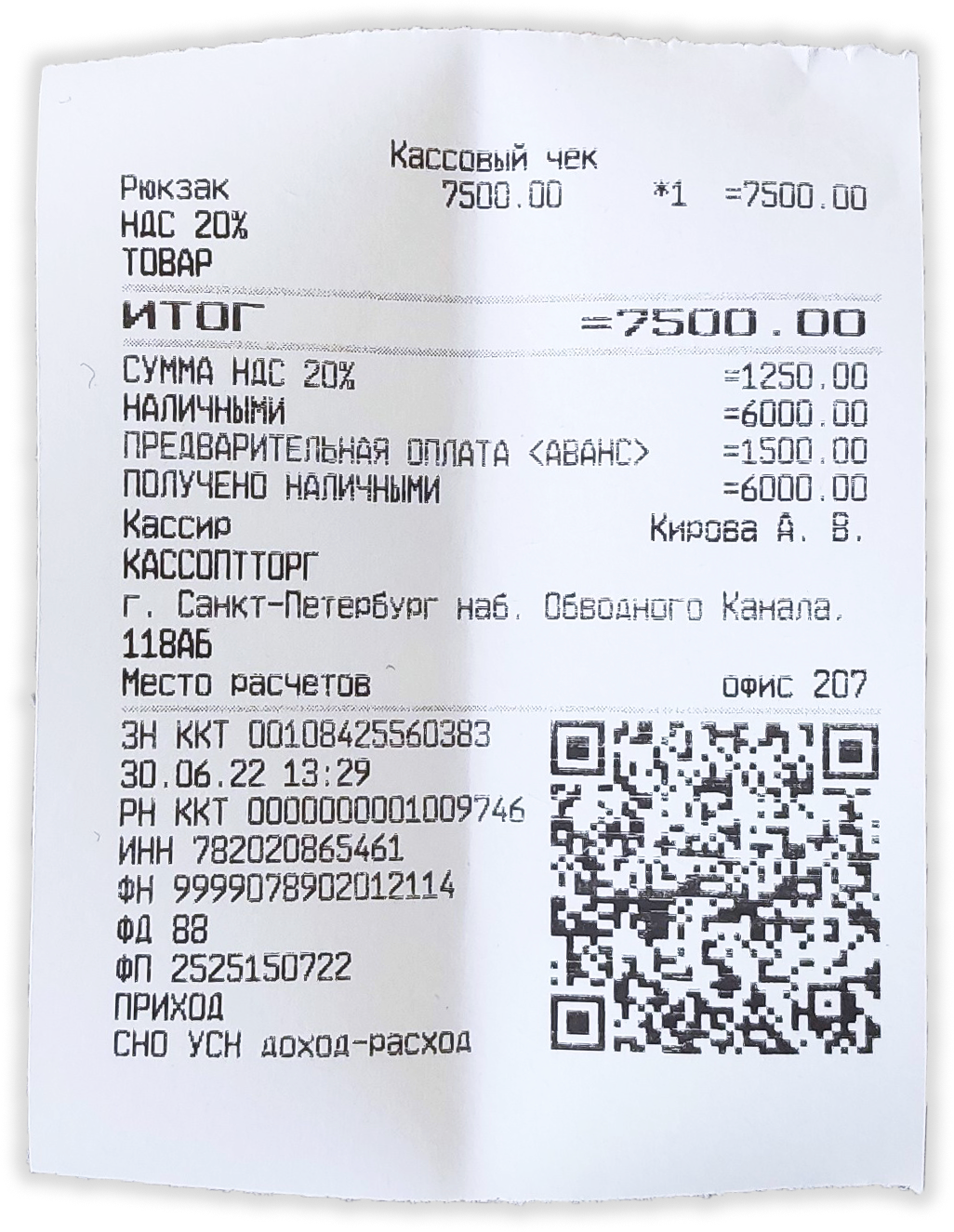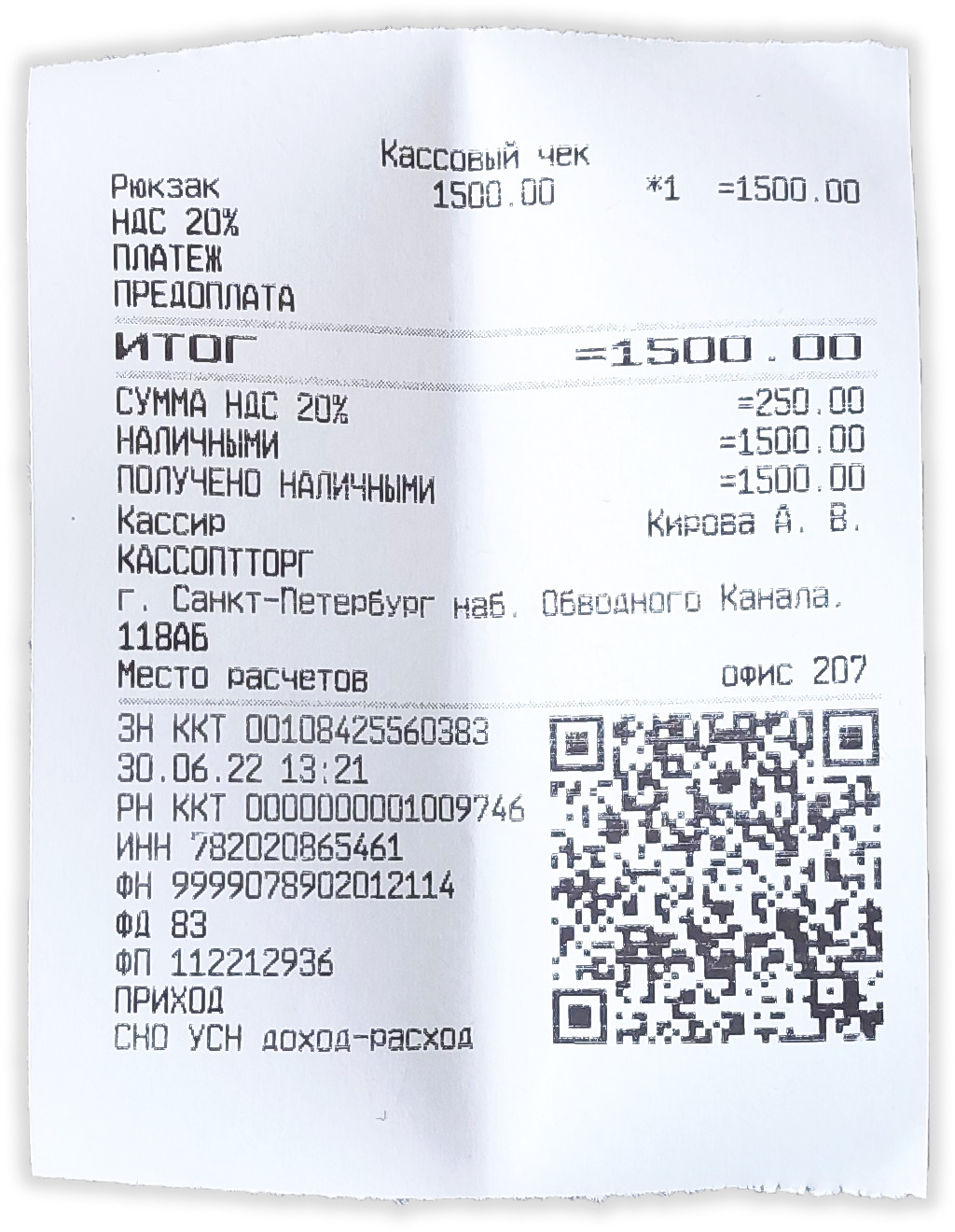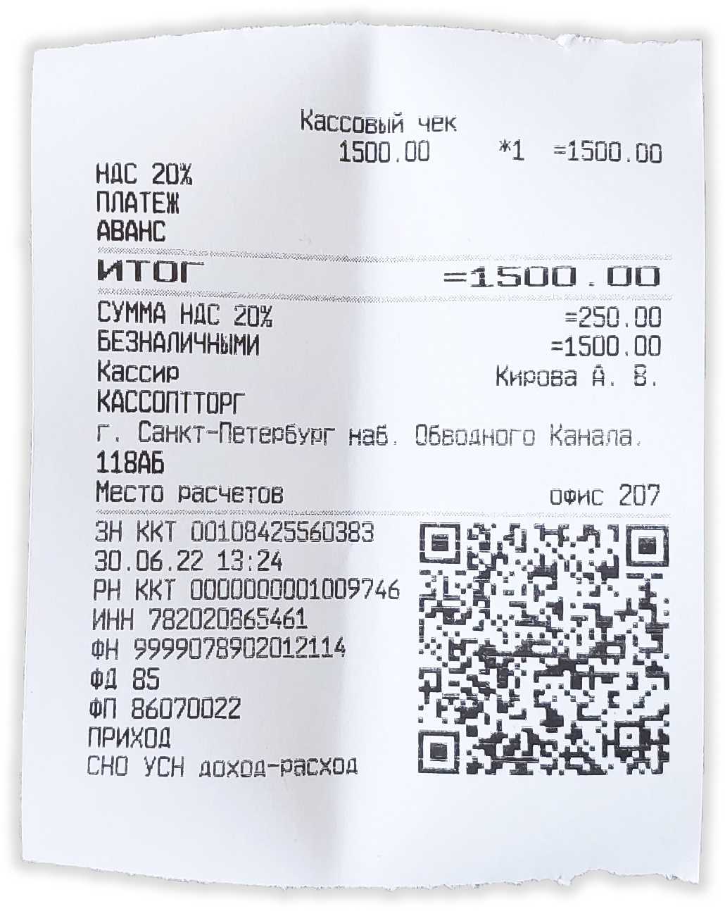 В этом чеке Способ расчета (полный расчет) и Предмет расчета (товар или услуга) останутся по умолчанию, их мы не меняем.Без доплаты